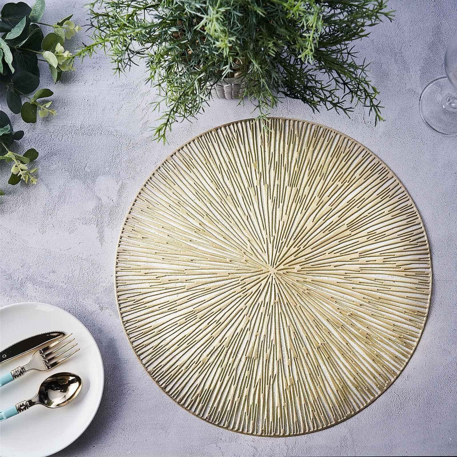 Enhance the style and sophistication of your table setting with our exquisite 6 Pack Gold Metallic Non-Slip Placemats. These stunning round vinyl table mats, measuring 15 inches in diameter, feature a chic spiked design and a weaved construction that adds a touch of luxury to any occasion. The shimmering gold metallic finish instantly elevates your table decor, making it perfect for weddings, parties, or any special event.